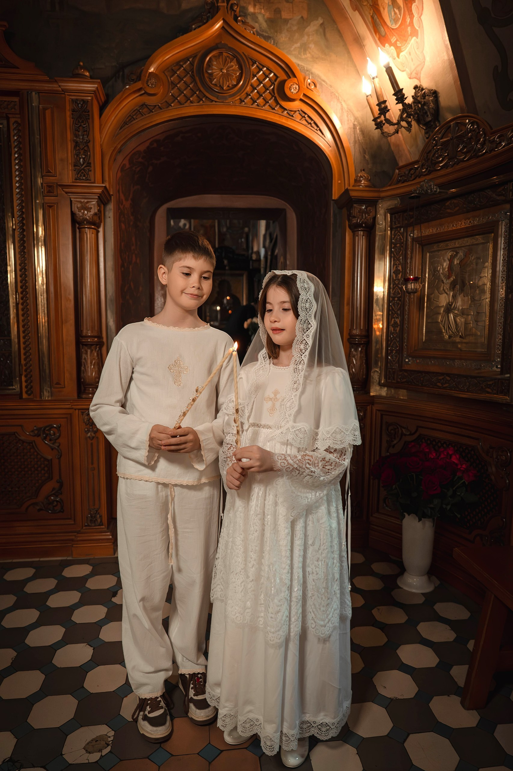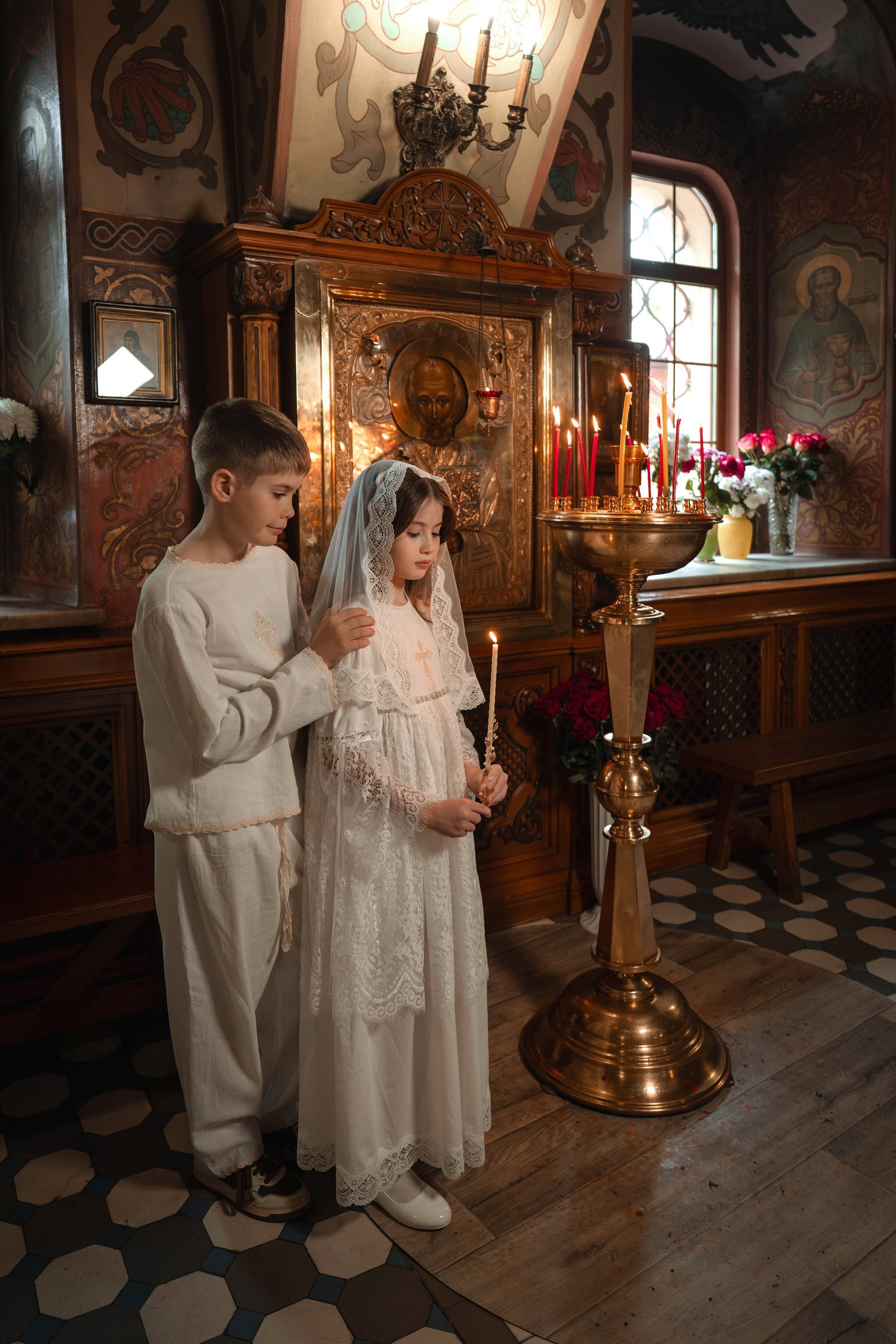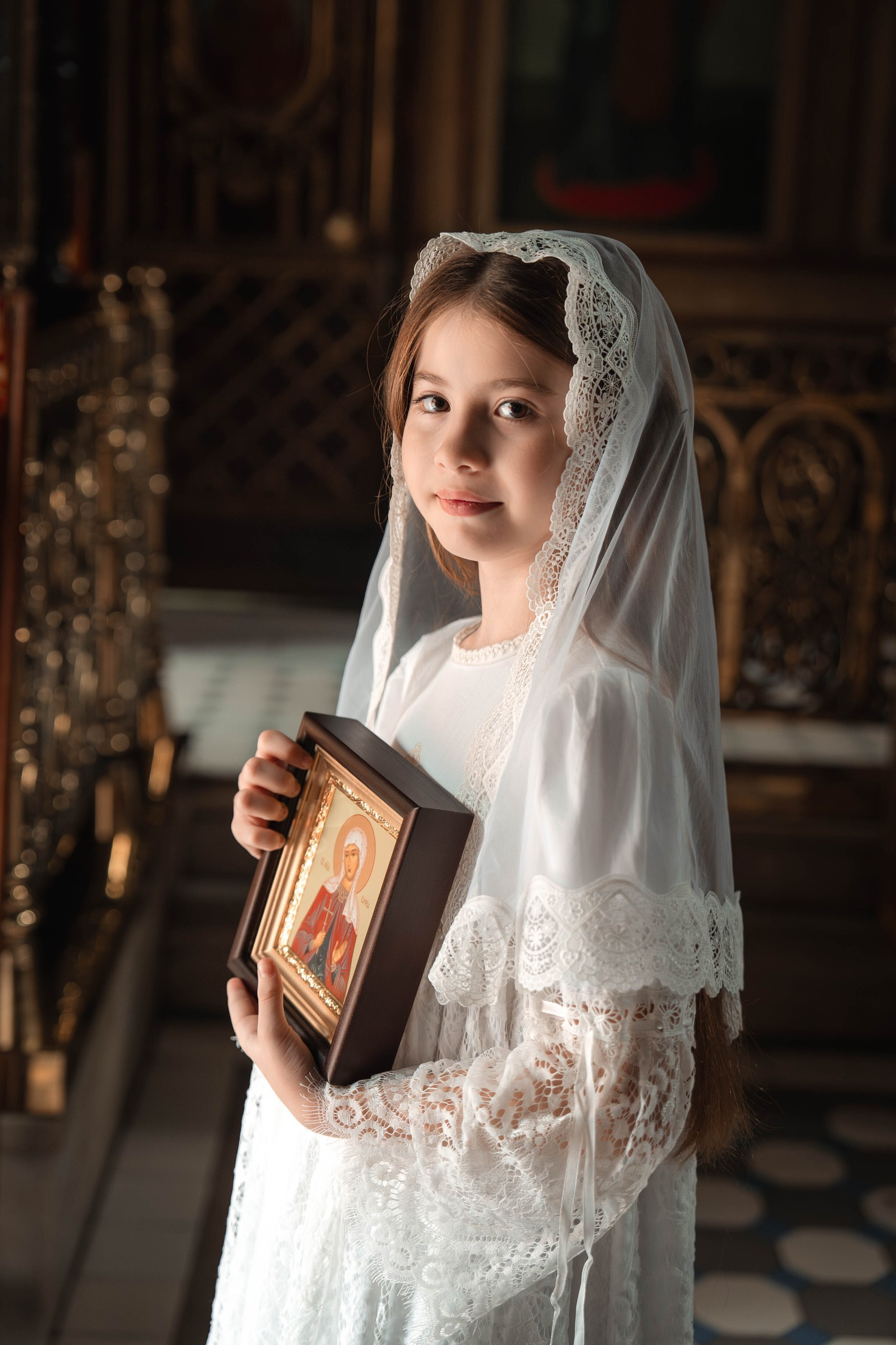 Возраст у малышки был сложный, ей уже хотелось бегать по храму, но длина платья мешала ей это сделать :))