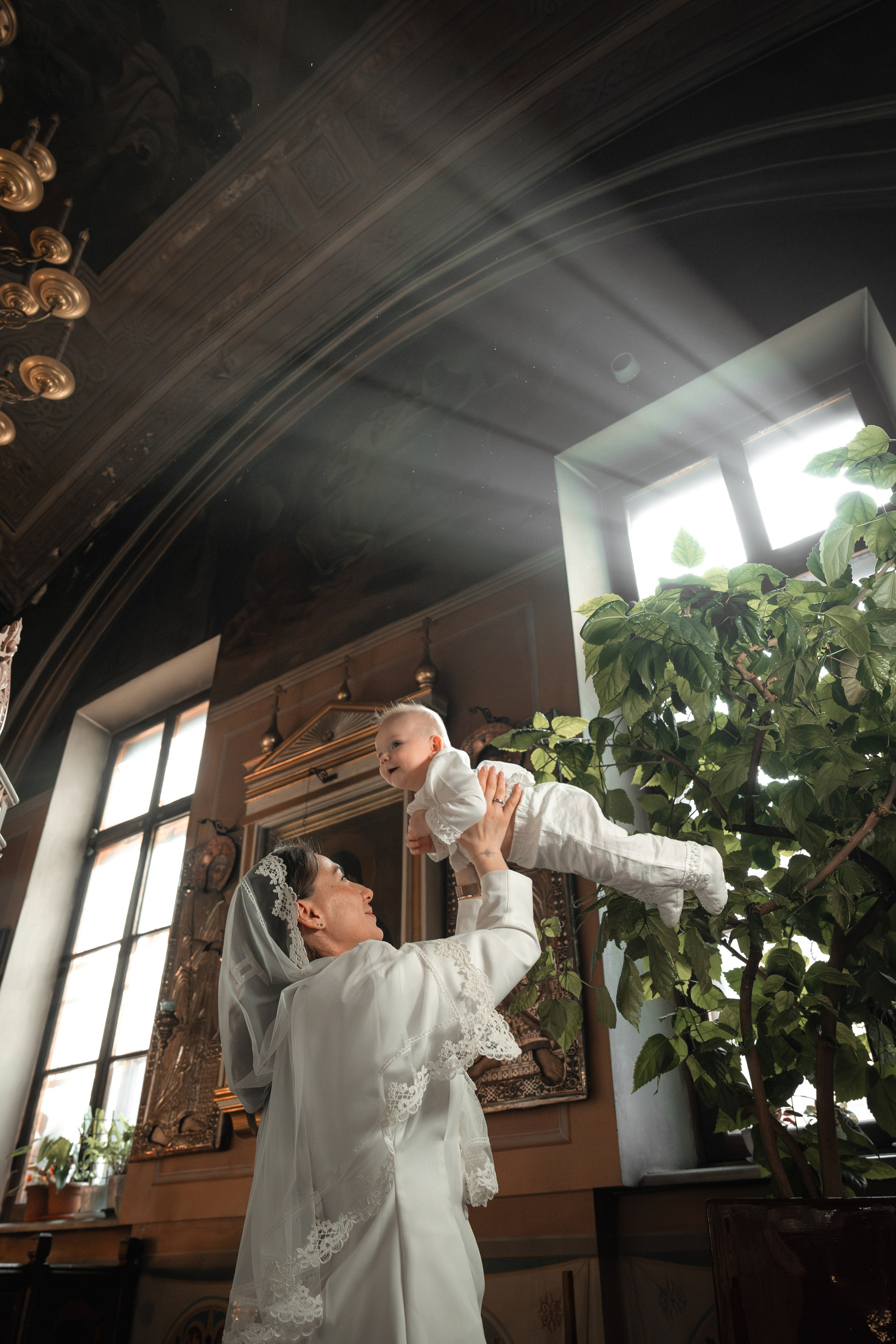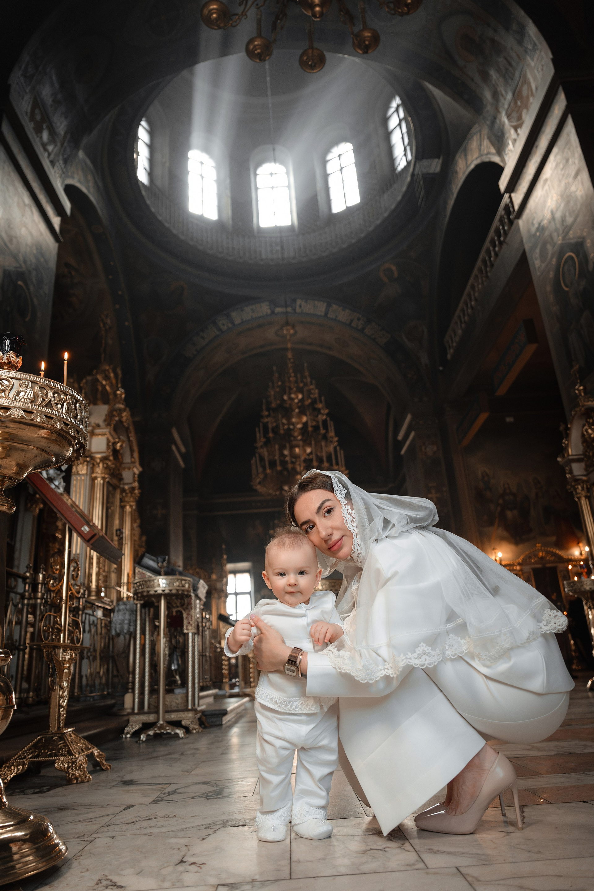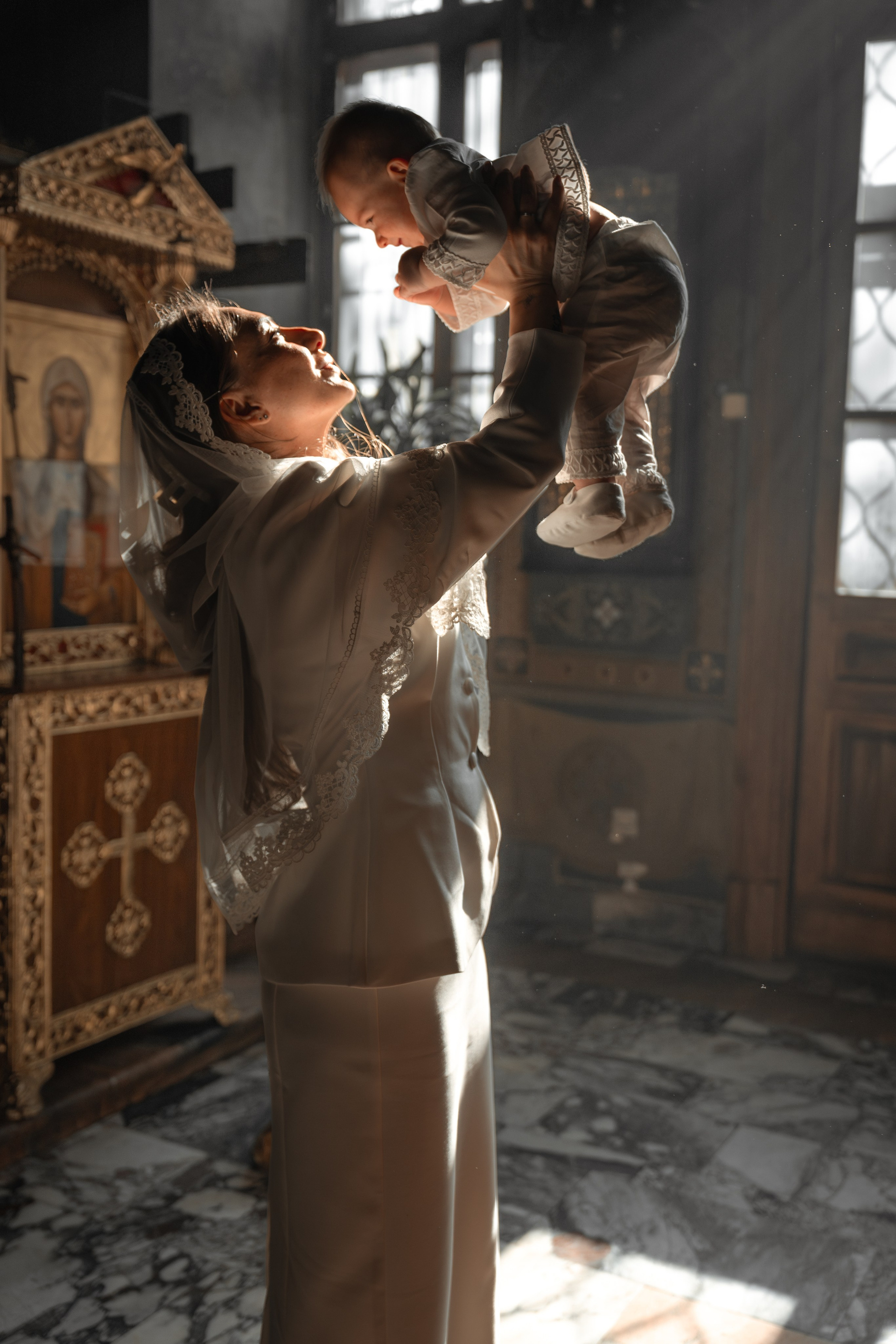 Возраст у малышки был сложный, ей уже хотелось бегать по храму, но длина платья мешала ей это сделать :))