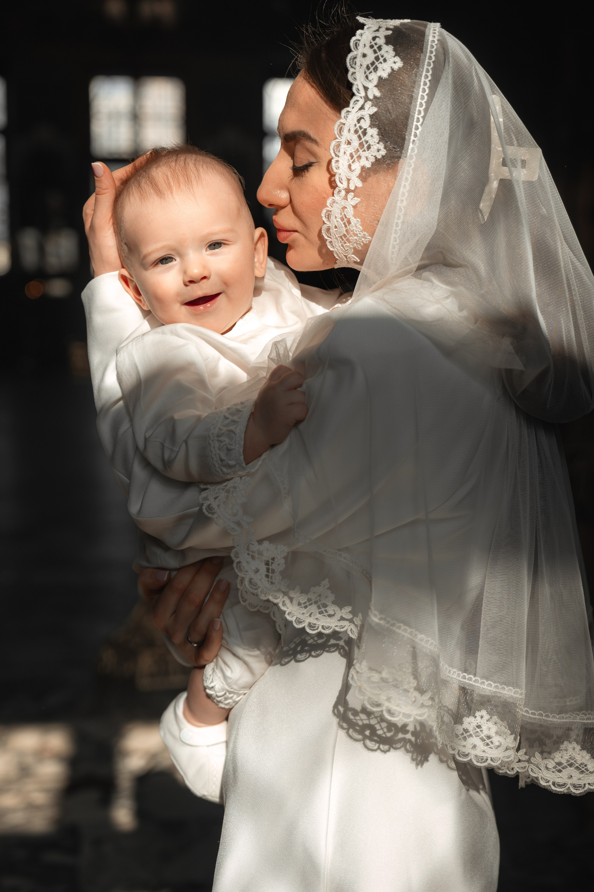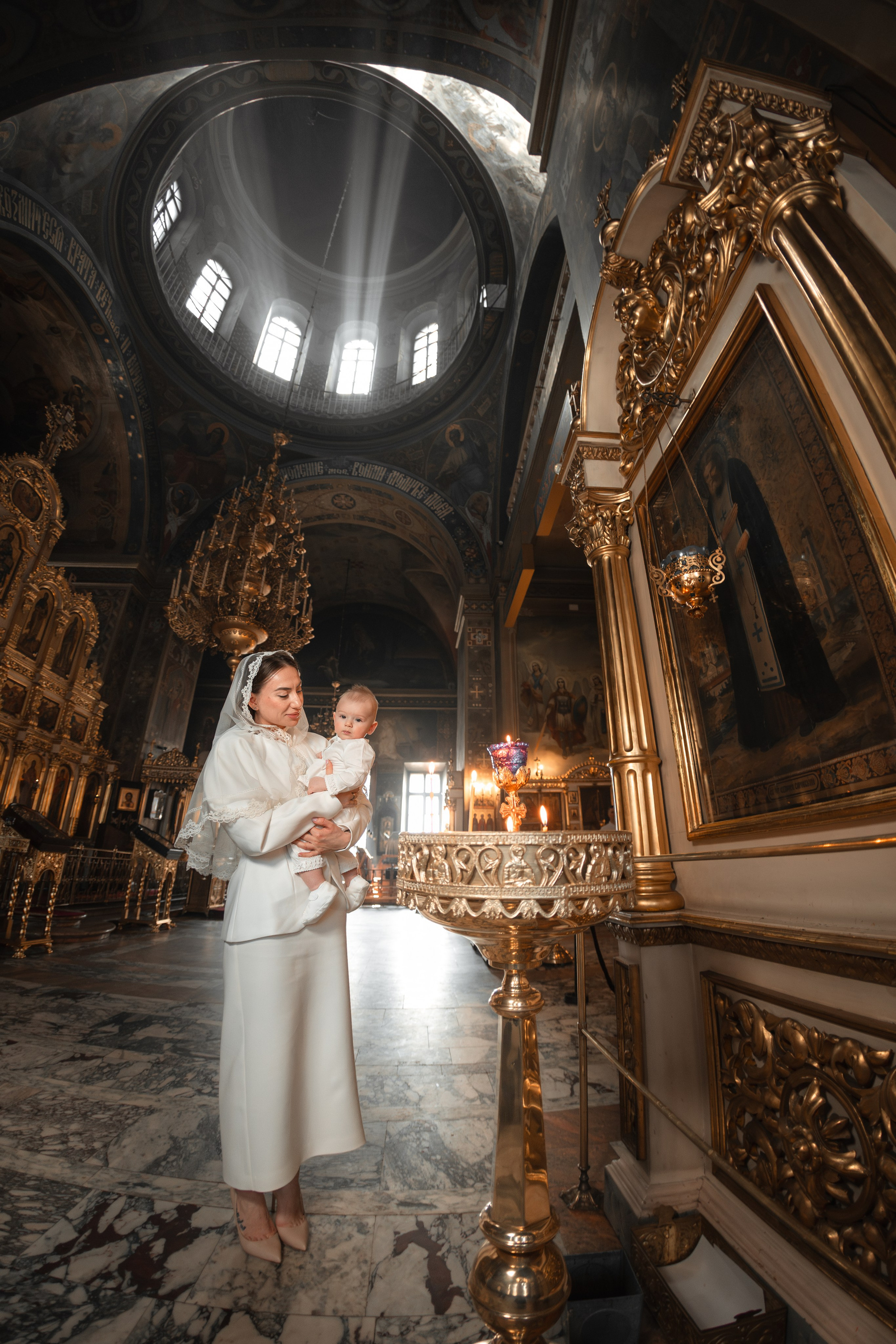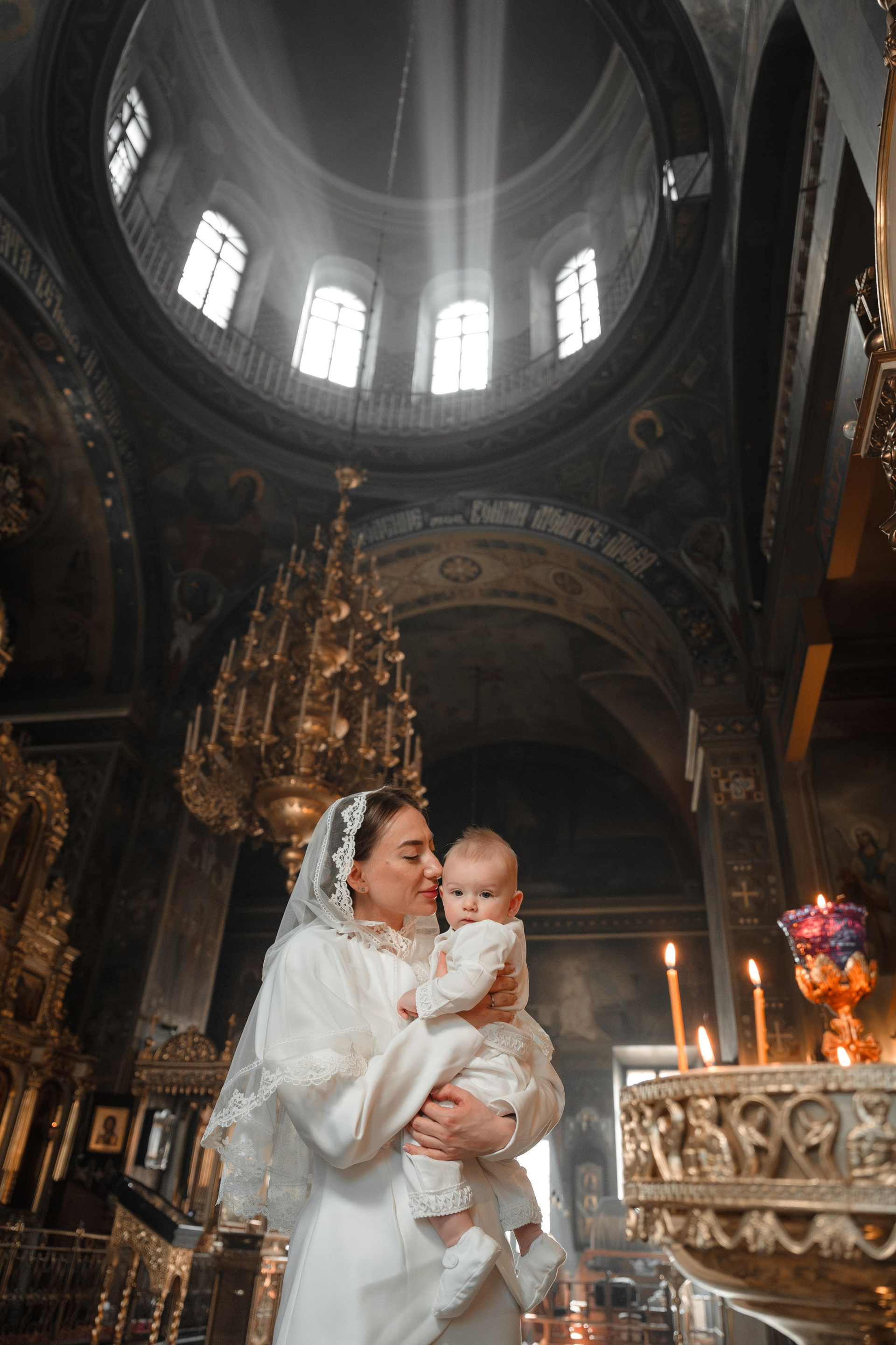 Возраст у малышки был сложный, ей уже хотелось бегать по храму, но длина платья мешала ей это сделать :))
